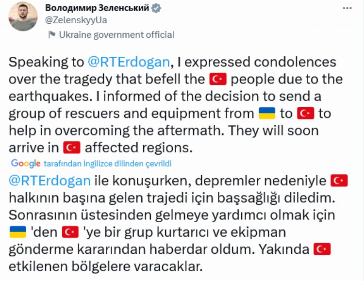 İSTANBUL (İGFA) - Cumhurbaşkanı Recep Tayyip Erdoğan'ı telefonla arayarak Kahramanmaraş merkezli depremler dolayısıyla 'geçmiş olsun' dileklerini ilettiğini hatırlatan Zelenskiy, "Ukraynalı kurtarıcılar, depremlerin ardından kurtarma operasyonunu desteklemek için Türkiye'ye gitti. Umarım mümkün olduğu kadar çok insanın hayatını kurtarmak mümkün olur." dedi.