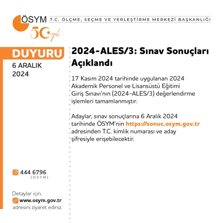 ÖSYM ayrıca, sınav sonuçlarının açıklanması sonrasında 2024-ALES/3 Sınavına yönelik cevap kâğıtları ve aday cevaplarını da erişime açtı. Cevap kağıtları 10 gün süreyle erişime açık kalacağı bildirildi.