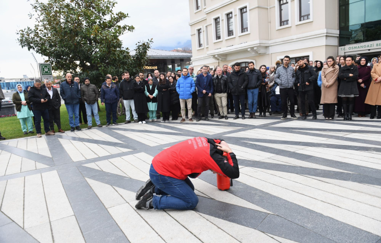 Afet İşleri Müdürlüğü personelinin yönlendirmesiyle Osmangazi Belediyesi merkez binası, 117 saniye gibi kısa sürede tümüyle tahliye edildi. Belediye binasının önünde toplanan personele Afet İşleri Müdürlüğü ekipleri, deprem ve yangın anında neler yapması gerektiğini uygulamalı olarak gösterdi. Ardından yakılan ateşe, doğru şekilde yangın söndürme tüpüyle nasıl müdahale edilmesi gerektiği anlatıldı.