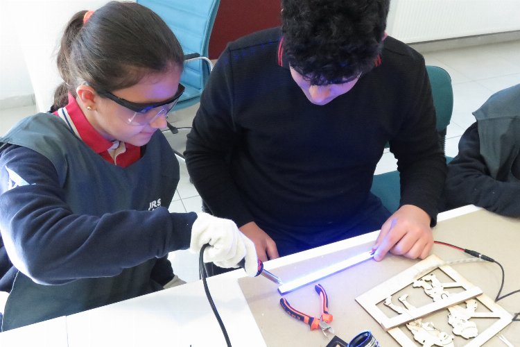 Depremin etkili olduğu şehirlerden Bursa’ya gelerek eğitim hayatlarını Nilüfer Azizsancar Ortaokulu’nda sürdüren 15 öğrenci, Büyükşehir Belediyesi ve Demirtaşpaşa MTAL Okulu işbirliğiyle düzenlenen etkinlik kapsamında BTM’yi ziyaret etti. Bursa’nın sembolü olan Hacivat ve Karagöz figürlü ahşap duvar lambası tasarım beceri atölyesine katılan öğrenciler, el becerilerini kullanarak kendi tasarımlarını yaptı.