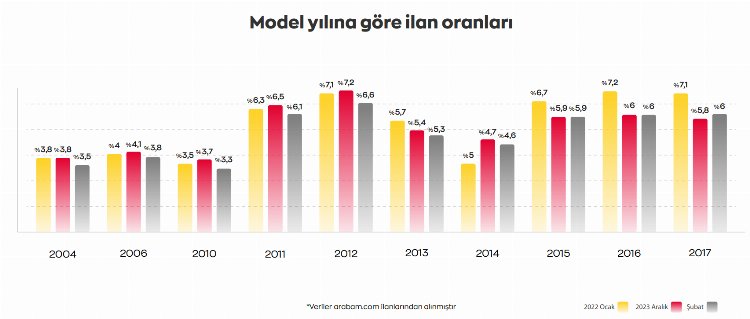 En fazla ilan verilen araçlar, yüzde 6,6 oranı ile 2012 yılına ait modeller olurken, 2012 model araçları da sırasıyla yüzde 6,1 ile 2011 ve yüzde 6 ile 2016 model araçlar takip etti. 2000 yılı ve öncesine ait araçlar ilanların aralık ayında olduğu gibi yüzde 14,4’ünü oluşturdu.