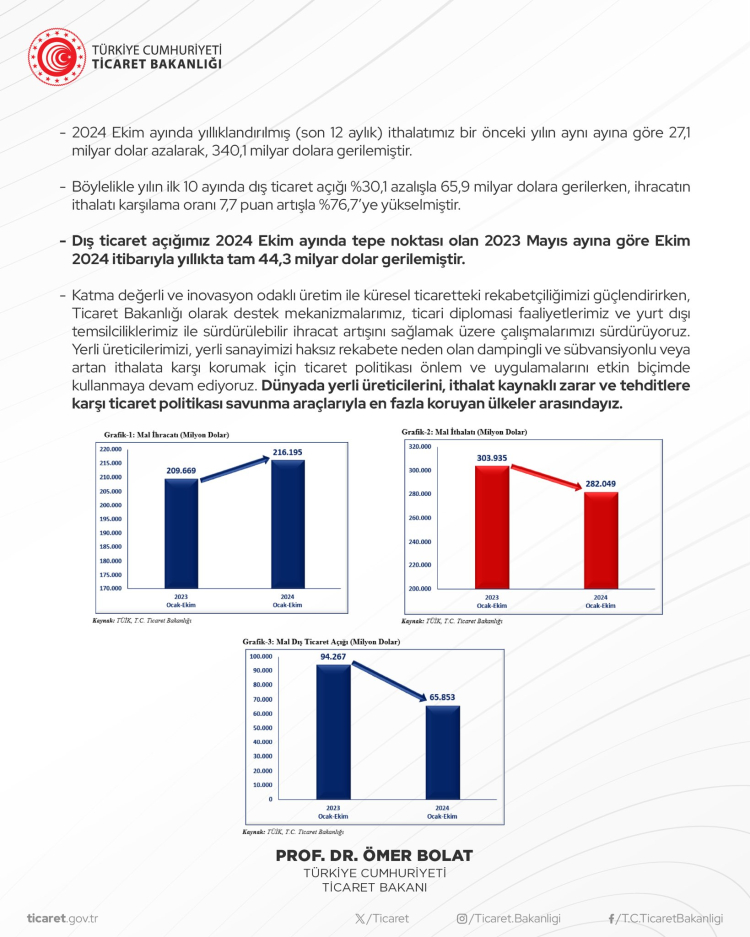ANKARA (İGFA) - Ticaret Bakanı Ömer Bolat, sosyal medya hesabından yaptığı paylaşımda Ekim ayı dış ticaret verilerini değerlendirdi.