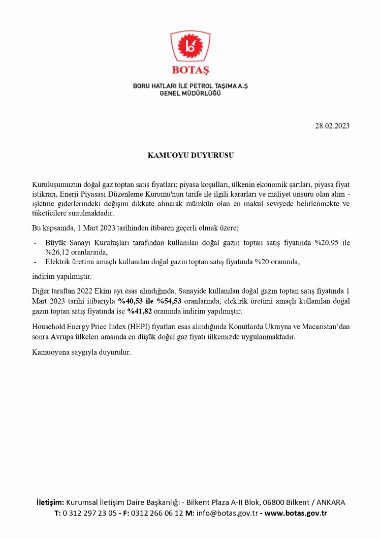 BOTAŞ, Mart ayı itibarıyla elektrik üretim amaçlı gazın satış fiyatında yüzde 20, sanayi kuruluşlarında ise yüzde 20,95 ile 26,12 arasında indirime gidileceğini açıkladı.