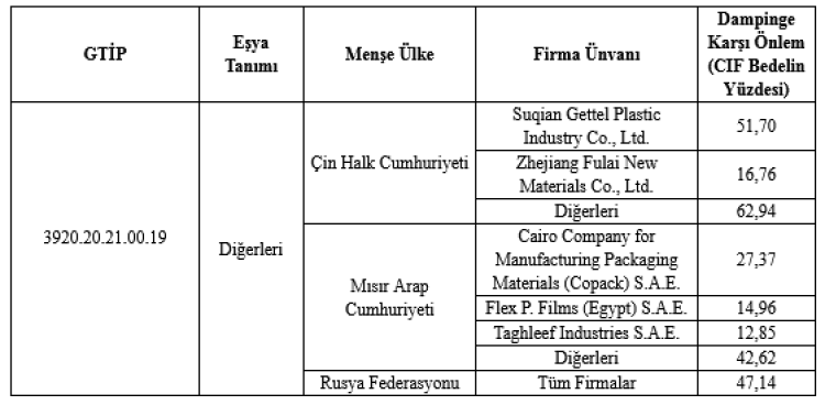 Bakanlık tarafından yürütülen soruşturma, 3920.20.21.00.19 gümrük tarife pozisyonu altındaki BOPP filmin dampingli ithalatının yerli üretimde zarara yol açtığını ortaya koydu.