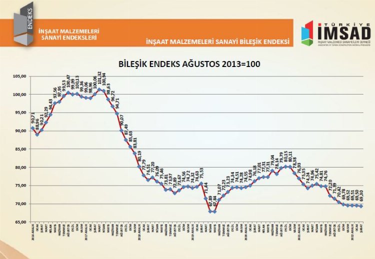 İnşaat malzemeleri sanayisinin çatı kuruluşu Türkiye İMSAD’ın raporuna göre; İnşaat Malzemeleri Sanayi Bileşik Endeksi, şubat ayında 69,30 puan seviyesine geriledi. Endeks verilerinde depremin etkileri hissedildi.