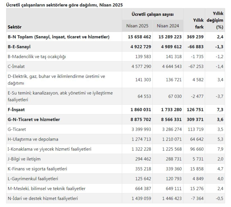Sektörel bazda incelendiğinde, 2025 Nisan ayında ücretli çalışan sayısı yıllık olarak inşaat sektöründe yüzde 7,3, ticaret-hizmet sektöründe yüzde 3,6 artarken, sanayi sektöründe yüzde 1,3 azaldı.