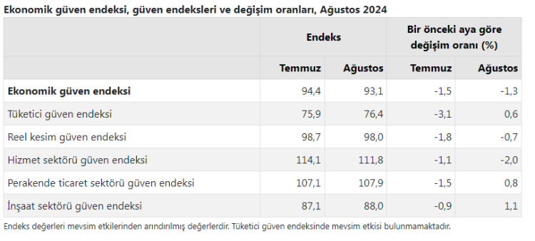 Ekonomik güven endeksi Temmuz ayında 94,4 iken, Ağustos ayında yüzde 1,3 oranında azalarak 93,1 değerini aldı.