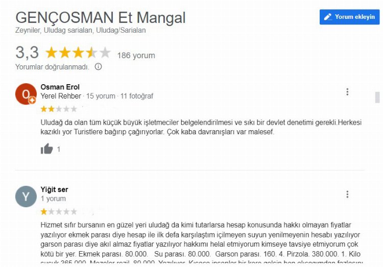 Osman Erol isimli vatandaş ise, Gençosman Et Mangal’ın turistlere bağırıp çağırdığını dile getirerek, “Uludağ’da olan tüm küçük büyük işletmeciler belgelendirilmesi ve sıkı bir devlet denetimi gerekli. Herkesi kazıklıyor. Turistlere bağırıp çağırıyorlar. Çok kaba davranışları var maalesef” diye tepki gösterdi.
