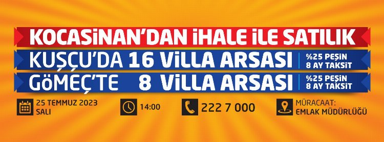 Kayseri'nin Kocasinan Belediyesi, Kayseri’nin denizi Kuşçu ve Gömeç’de bulunan 24 adet villa arsasını, yüzde 25 peşin ve 8 ay taksit seçeneği ile 25 Temmuz Salı günü düzenlenecek ihale ile satışa sunacak.