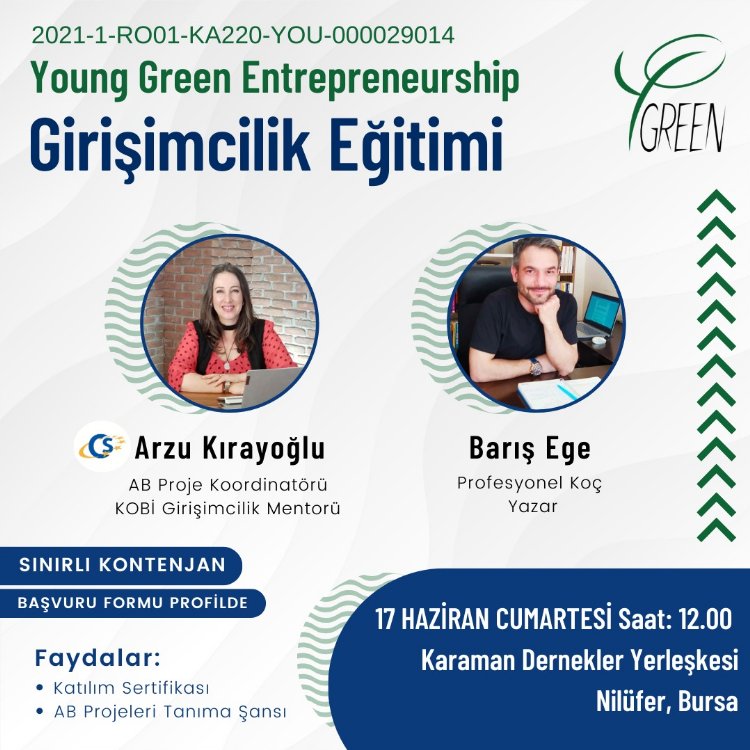 BURSA (İGFA) - Kültür, Eğitim ve Proje Derneği (KEPDER) ile ConfideaStar Proje Eğitim ve Yönetim Danışmanlık; Erasmus Plus K2 projesi kapsamında Young Green Entrepreneurship (Girişimcilik Eğitimi) düzenleniyor. AB Proje Koordinatörü ve KOBİ Girişimcilik Mentörü Arzu Kırayoğlu ile Profesyonel Koç Yazar Barış Ege tarafından verilecek eğitimlerle, genç girişimcilere iş planı hazırlama konusunda bilgiler sunulacak.