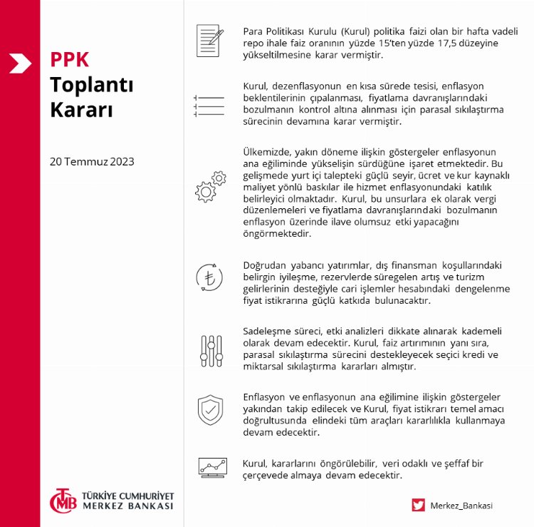 Merkez Bankası'nın karar metninde, "Kurul, dezenflasyonun en kısa sürede tesisi, enflasyon beklentilerinin çıpalanması, fiyatlama davranışlarındaki bozulmanın kontrol altına alınması için parasal sıkılaştırma sürecinin devamına karar vermiştir. Ülkemizde, yakın döneme ilişkin göstergeler enflasyonun ana eğiliminde yükselişin sürdüğüne işaret etmektedir. Bu gelişmede yurt içi talepteki güçlü seyir, ücret ve kur kaynaklı maliyet yönlü baskılar ile hizmet enflasyonundaki katılık belirleyici olmaktadır. Kurul, bu unsurlara ek olarak vergi düzenlemeleri ve fiyatlama davranışlarındaki bozulmanın enflasyon üzerinde ilave olumsuz etki yapacağını öngörmektedir" denildi.