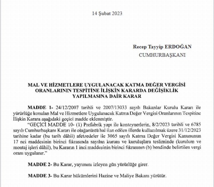 Buna göre, depremden etkilenen 10 ilde prefabrik yapı ve konteynerlerin, afetzedeler ile ilgili kurum ve kuruluşlara tesliminde KDV oranı yıl sonuna kadar yüzde 18’den yüzde 1’e düşürülmüş oldu.