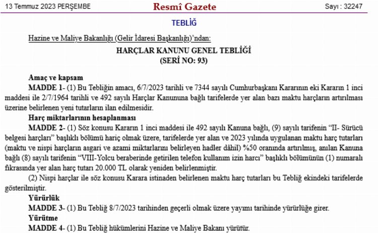 Cumhurbaşkanı Recep Tayyip Erdoğan'ın imzasıyla Resmi Gazete'de yayımlanan karara göre harçlara yapılan yüzde 50 oranındaki artışla belirlenen yeni tarifeler açıklanarak yürürlüğe girdi.