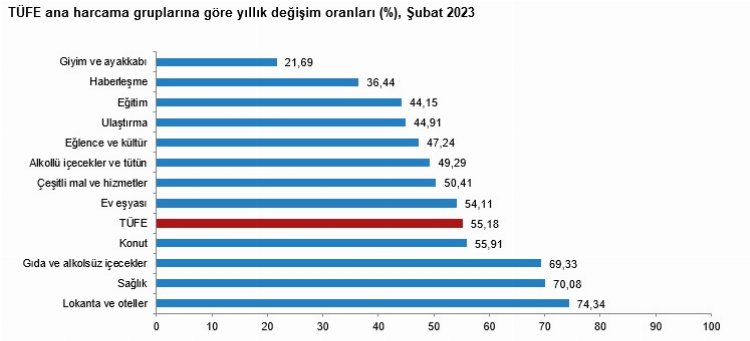 Ana harcama grupları itibarıyla 2023 yılı Şubat ayında bir önceki aya göre en az artış gösteren ana grup yüzde -1,76 ile giyim ve ayakkabı oldu. Buna karşılık, 2023 yılı Şubat ayında bir önceki aya göre artışın en yüksek olduğu ana grup ise yüzde 7,36 ile gıda ve alkolsüz içecekler oldu.