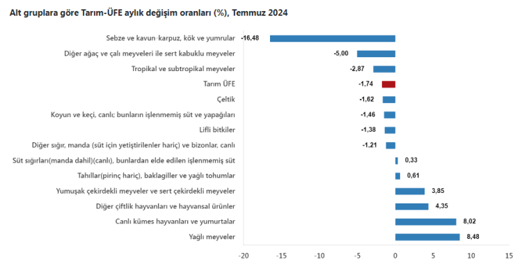 Tarım-ÜFE'de 2024 yılı Temmuz ayında bir önceki aya göre yüzde 1,74 azalış, bir önceki yılın Aralık ayına göre yüzde 19,79 artış, bir önceki yılın aynı ayına göre yüzde 41,07 artış ve 12 aylık ortalamalara göre yüzde 59,61 artış gerçekleşti.