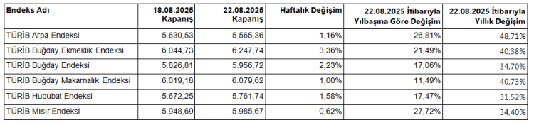 Türkiye Ürün İhtisas Borsası (TÜRİB), 18-22 Ağustos 2025 haftasında Elektronik Ürün Senedi (ELÜS) Piyasası’nda buğday, mısır ve arpa fiyatlarında genel bir artış gözlendiğini duyurdu. Buğday Ekmeklik Endeksi yüzde 3,36 ile en yüksek haftalık artışı kaydederken, Arpa Endeksi yüzde 1,16 düşüş gösterdi.