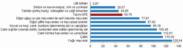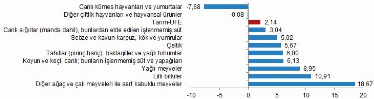 Yıllık Tarım-ÜFE'ye göre 3 alt grup daha düşük, 7 alt grup daha yüksek değişim gösterdi.