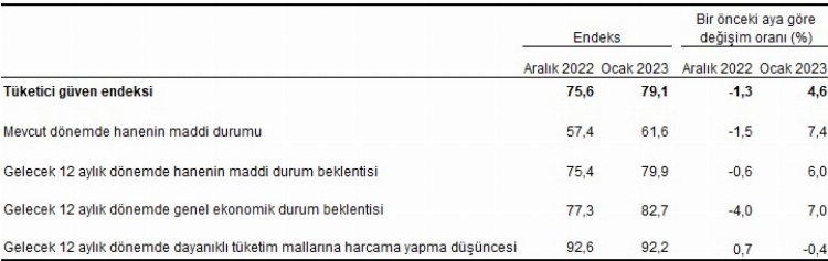 TÜİK ve Merkez Bankası işbirliği ile yürütülen tüketici eğilim anketi sonuçlarından hesaplanan Tüketici Güven Endeksi, Ocak ayında bir önceki aya göre yüzde 4,6 oranında artarken, Aralık ayında 75,6 olan endeks, Ocak ayında 79,1 oldu.