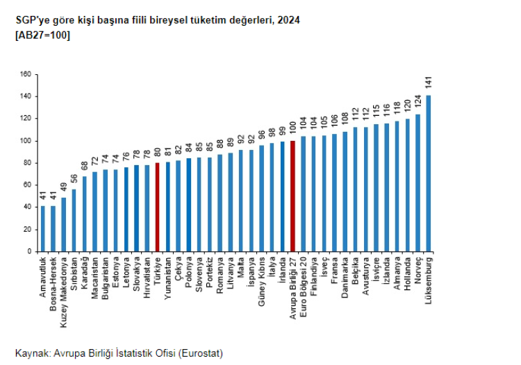 Eurostat’ın 2024 SGP verilerine göre, Türkiye’nin kişi başına GSYH endeksi, 27 AB ülkesinin ortalaması olan 100’ün yüzde 29 altında, 71 seviyesinde gerçekleşti. Fiili bireysel tüketim düzeyi ise AB ortalamasının yüzde 20 gerisinde, 80 olarak kaydedildi. Türkiye’nin fiili bireysel tüketime ilişkin fiyat düzeyi endeksi 47 oldu, bu da Türkiye’nin AB’ye kıyasla “ucuz” bir ülke olduğunu gösterdi.