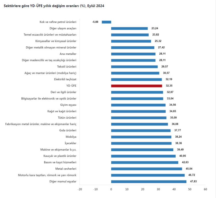 YD-ÜFE 2024 yılı Eylül ayında bir önceki aya göre yüzde 2,25 artış, bir önceki yılın Aralık ayına göre yüzde 23,34 artış, bir önceki yılın aynı ayına göre yüzde 32,35 artış ve 12 aylık ortalamalara göre yüzde 50,09 artış gösterdi.