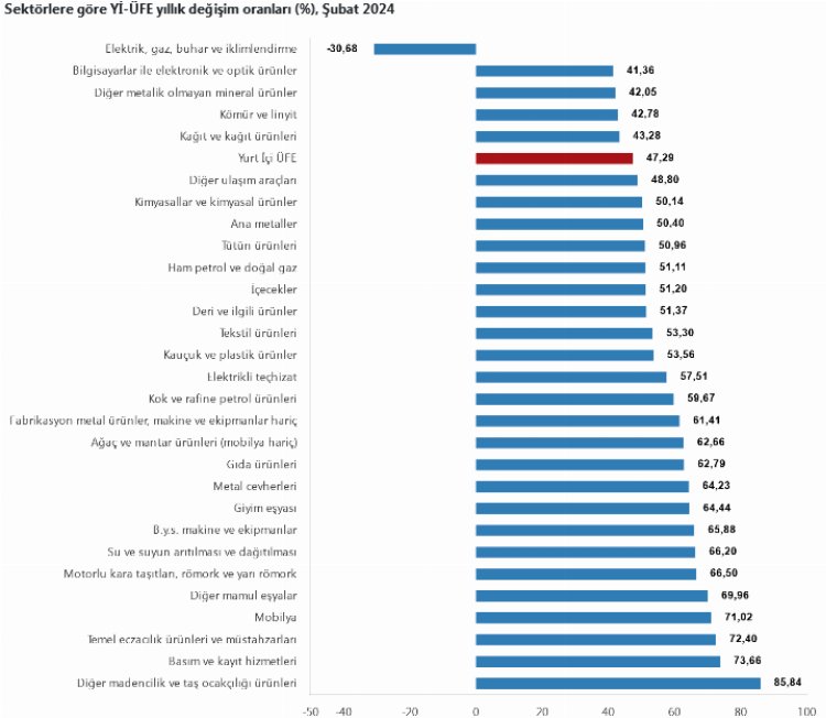 TÜİK'in Şubat ayı verilerine göre Yurt İçi Üretici Fiyat Endeksi (Yİ-ÜFE) yıllık yüzde 47,29 arttı, aylık yüzde 3,74 arttı.