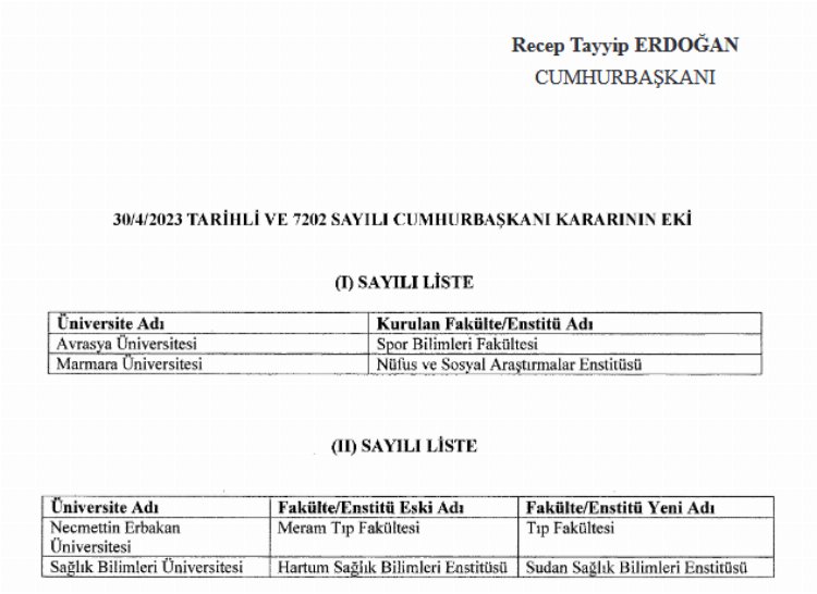 Söz konusu Resmi Gazete'deki karara göre, Necmettin Erbakan Üniversitesi'nde "Meram Tıp Fakültesi"nin adı "Tıp Fakültesi" olarak, Sağlık Bilimleri Üniversitsi'nde "Hartum Sağlık Bilimleri Enstitüsü"nün adı "Sudan Sağlık Bilimleri Enstitüsü" olarak değiştirildi.