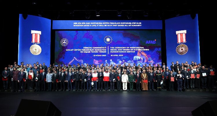 Deprem sonrası çalışmalarda sembolleşen isimler, kurumlar ile ekiplerin yerli ve yabancı temsilcilerine Devlet Üstün Fedakârlık Madalyası ve Nişanı takdim ederek deprem bölgesindeki çabaları dolayısıyla şükranlarını sunduğunu belirten Cumhurbaşkanı Erdoğan, madalya ve nişan alanlarla birlikte arama kurtarma ekiplerine, madencilere, itfaiyecilere, belediyelere, kamu görevlilerine, sivil toplum kuruluşlarına, gönüllülere, yardım çağrısına destek veren tüm yabancılara teşekkür etti.