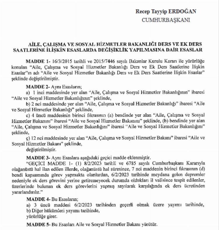 Cumhurbaşkanı Erdoğan'ın imzasıyla bugünkü Resmi Gazete'de yayımlanan karara göre; Kahramanmaraş merkezli depremler sonrası OHAL ilan edilen illerdeki ek ders görevini yerine getiremeyecek durumda olanların İl Valiliklerince tespit edilip, görevini yapmış sayılabileceği belirtildi.