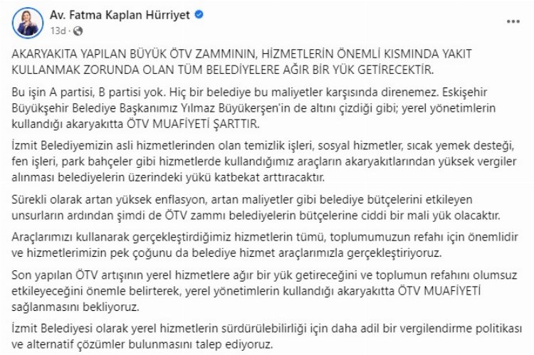 İzmit Belediye Başkanı Fatma Kaplan Hürriyet, akaryakıta yapılan ÖTV zammının tüm belediyelere ağır bir yük getireceğini ifade ederek, “Yerel yönetimlerin kullandığı akaryakıtta ÖTV muafiyeti şarttır” dedi