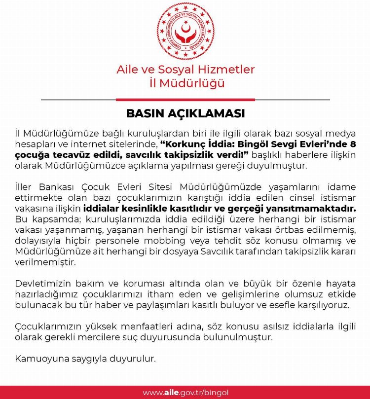 "İl Müdürlüğümüze bağlı kuruluşlardan biri ile ilgili olarak bazı sosyal medya hesapları ve internet sitelerinde, ‘Korkunç İddia: Bingöl Sevgi Evlerinde 8 çocuğa tecavüz edildi, savcılık takipsizlik verdi’ başlıklı haberlere ilişkin olarak Müdürlüğümüzce açıklama yapılması gereği duyulmuştur. İller Bankası Çocuk Evleri Sitesi Müdürlüğümüzde yaşamlarını idame ettirmekte olan bazı çocuklarımızın karıştığı iddia edilen cinsel istismar vakasına ilişkin iddialar kesinlikle kasıtlıdır ve gerçeği yansıtmamaktadır.