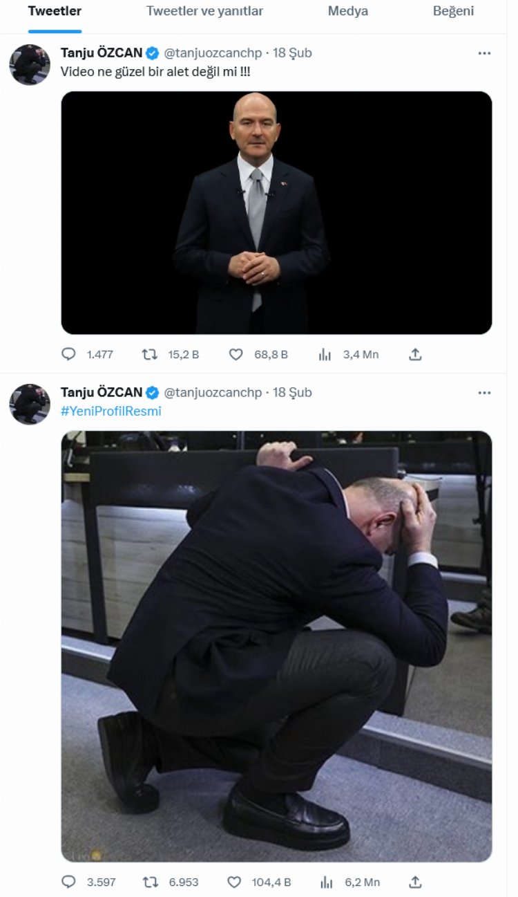 Önce 'Çök-Kapan-Tutun' tatbikatındaki İçişleri Bakanı Süleyman Soylu'nun tatbikat anındaki fotoğrafını #YeniProfilResmi etiketiyle güncelleyip paylaşan Başkan Özcan, ardından da yine Bakan Soylu'nun Türkiye'deki depremler ve afetlerle ilgili sunumu video görselini "Video ne güzel bir alet değil mi!!!" yorumuyla paylaştı.