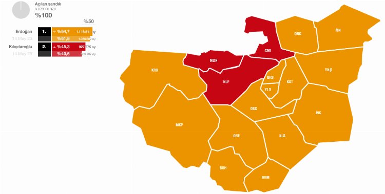 Yenişehir'de 37 bin 533 geçerli oydan yüzde 55,77'sini Erdoğan, yüzde 44,23'ünü Kılıçdaroğlu aldı.