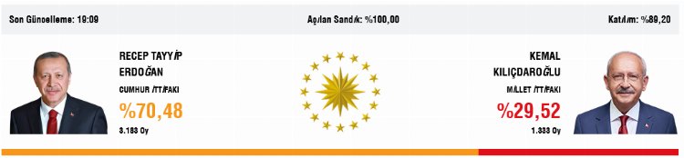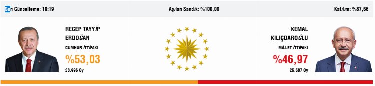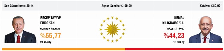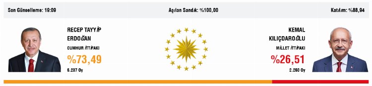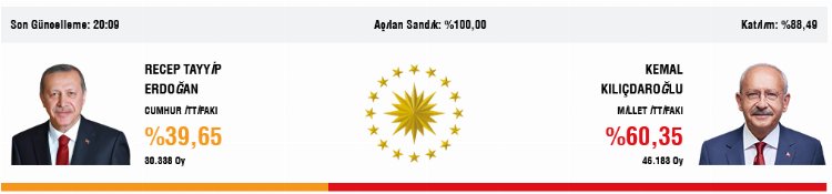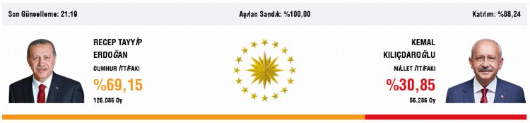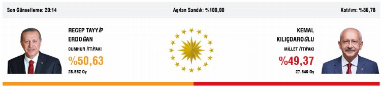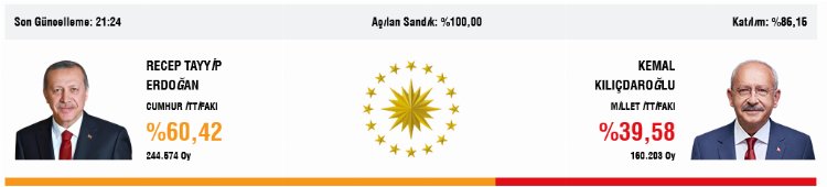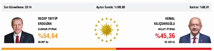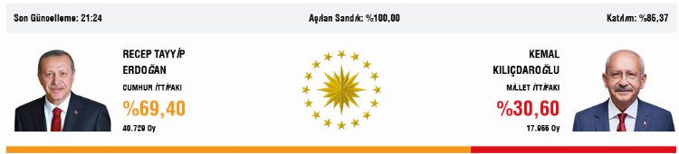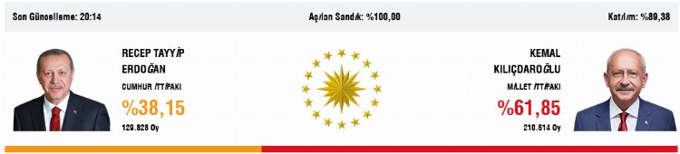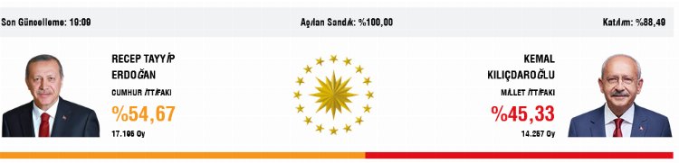 Oyların 2 milyon 46 bin 286'sı geçerli sayıldı. 1 milyon 118 bin 511 oy Recep Tayyip Erdoğan'a, 927 bin 775 oy ise Kemal Kılıçdaroğlu'na çıktı.