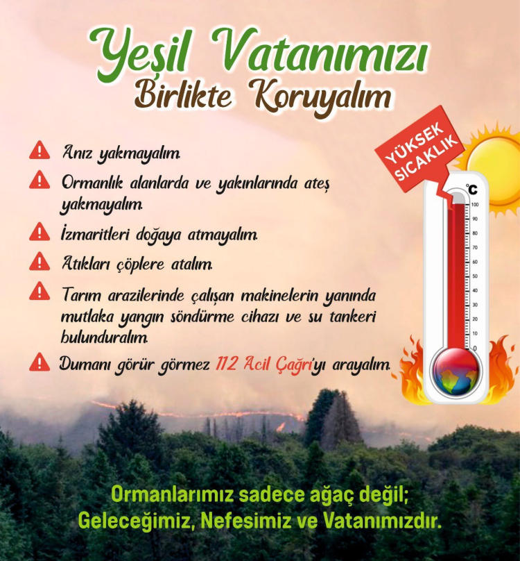 Vatandaşlardan ateş yakmamaları, anız yakmaktan kaçınmaları, sigara izmariti atmamaları ve doğada atık bırakmamaları konusunda hassasiyet göstermeleri istendi.Müdürlük, “Ormanlarımız bizim geleceğimiz. Bir kıvılcım felakete yol açabilir. Lütfen sorumlu davranalım, yangınları önlemek için hep birlikte hareket edelim” çağrısında bulundu. Yetkililer, özellikle piknik alanlarında ve ormanlık bölgelerde dikkatli olunması gerektiğini belirtirken, yangın riskini azaltmak için herkesin üzerine düşen sorumluluğu yerine getirmesi gerektiğini vurguladı.