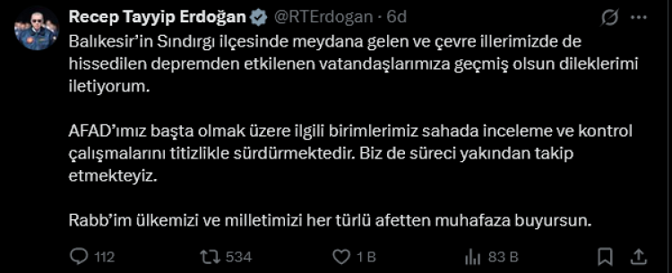 ANKARA (İGFA) - Cumhurbaşkanı Erdoğan, Balıkesir'in Sındırgı ilçesinde meydana gelen deprem ardından sosyal medya hesabından paylaşımda bulundu.