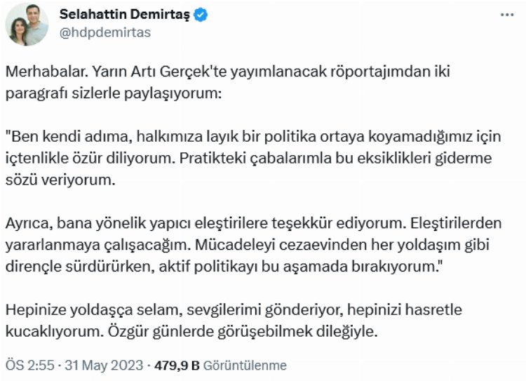 ANKARA (İGFA) - Edirne Cezaevi’nde tutuklu bulunan HDP Eş Genel eski Başkanı Selahattin Demirtaş, sosyal medya hesabından yaptığı paylaşmda, Artı Gerçek’te yayımlanacak röportajının bir kısmınndan alıntılayarak,  aktif politikayı bıraktığını duyurdu.