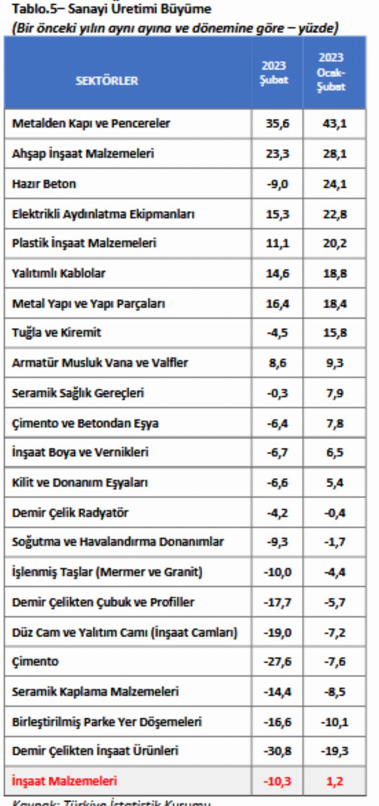 En yüksek artış yüzde 35,6 ile metal kapı ve pencere sektöründe yaşanırken, ikinci sırada yüzde 23,3 artış ile ahşap inşaat malzemeleri, üçüncü sırada ise yüzde 15,3 ile elektrikli aydınlatma ekipmanları yer aldı.
