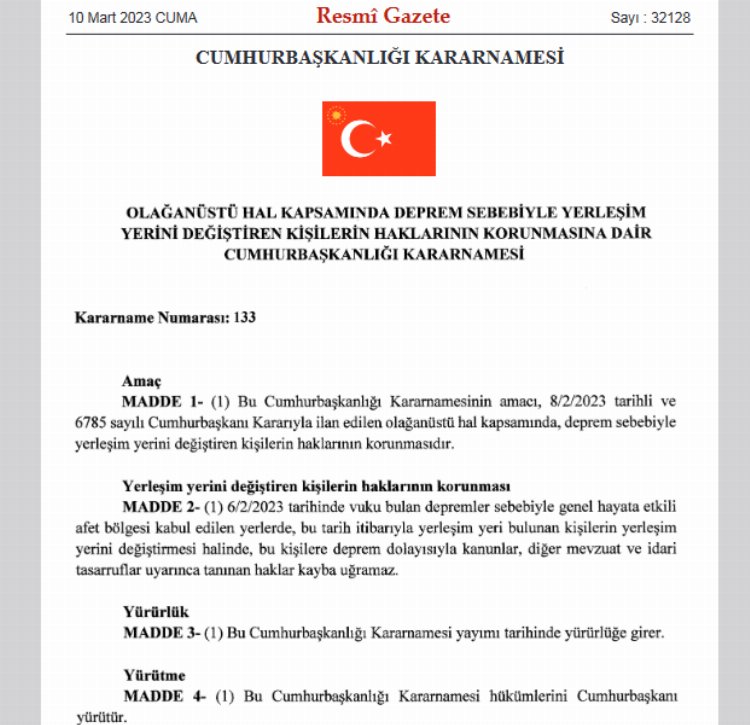 Yayımlanan kararname ile Kahramanmaraş merkezli depremler sonrası yerleşim yerini değiştiren kişilerin haklarının korunmasına ilişkin düzenleme yapıldı.
