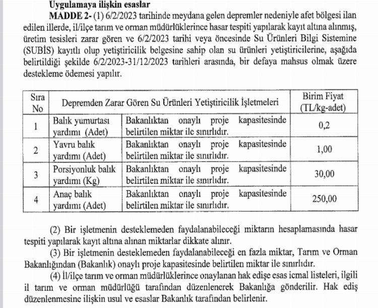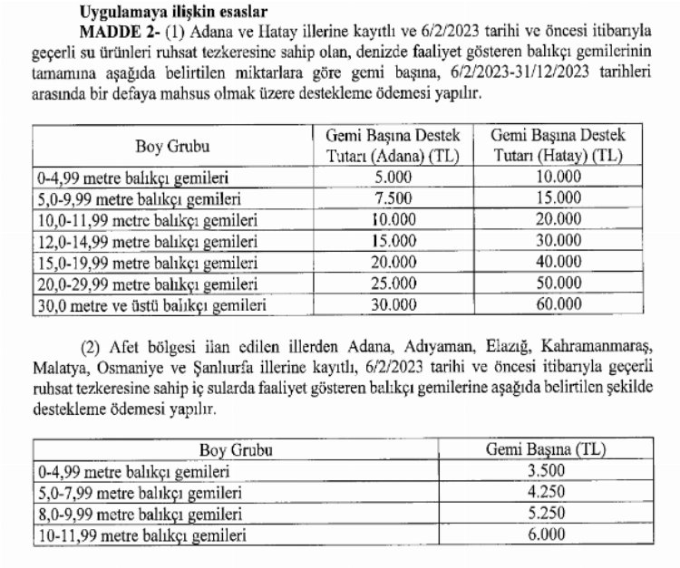 Öte yandan yine bugünkü Resmi Gazete'de yayımlanan Deniz ve İç Sularda Avcılık Yapan Balıkçıların Desteklenmesine İlişkin Karara göre de, 5 metreden küçük balıkçı teknelerine Adana'da 5 bin, Hatay'da 10 bin lira tutarında yardım yapılması kararlaştırıldı.