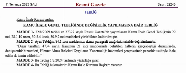 ANKARA (İGFA) - Kamu İhale Kurumunun "Doğrudan Temin Yöntemiyle Yapılacak Alımlara İlişkin Tebliğ"i bugünkü Resmi Gazete'de yayımlandı. Tebliğ ile Kamu İhale Kanunu kapsamındaki idarelerin doğrudan temin yöntemiyle yapacakları alımlara ilişkin usul ve esaslar düzenlendi.