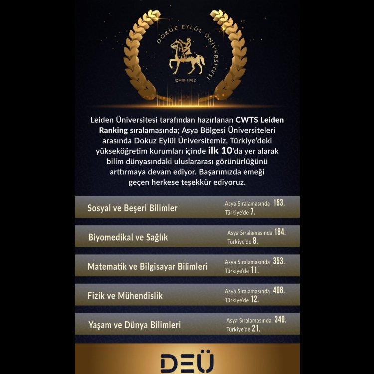 Bilimsel etki, iş birliği, açık erişim yayıncılığı ve cinsiyet çeşitliliği gibi parametreleri baz alan CWTS LeidenRanking 2023 raporuna göre DEÜ’nün Türkiye’deki yükseköğretim kurumları arasında ilk 10’da yer aldığını ifade eden DEÜ Rektörü Prof. Dr. Nükhet Hotar, “Medikal ve Sağlık Bilimleri alanında Asya Üniversiteleri arasında 184’üncü olan kurumumuz, Türkiye’deki yükseköğretim kurumları arasında ise 8’inci oldu. Yine aynı listenin Sosyal ve Beşerî Bilimler alanında Asya bölgesindeki üniversiteler arasında 153’üncü olurken, Türkiye’deki yükseköğretim kurumları arasında ise 7’nci olduk. Tabii ki kurumumuzun bu başarıları elde etmesi tesadüf değil, köklü ve büyük ailemizin her bir ferdinin gayretli çalışmalarının ürünüdür” dedi.