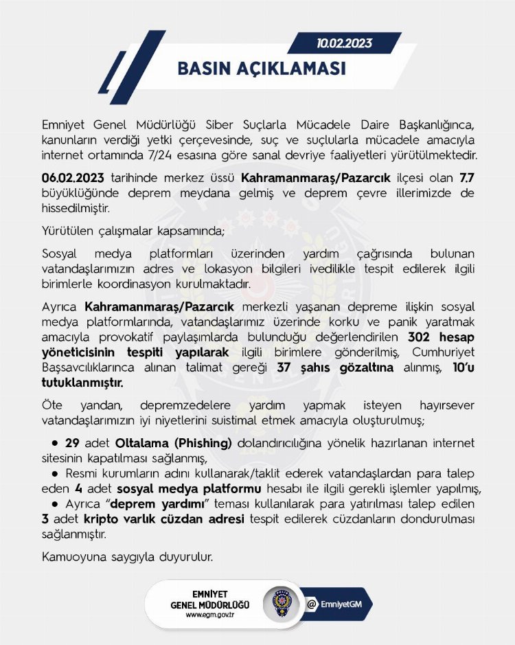 "Depremzedelere yardım yapmak isteyen vatandaşlarımızın iyi niyetlerini suiistimal etmek amacıyla oluşturulmuş; 29 adet Oltalama (Phishing) dolandırıcılığına yönelik hazırlanan internet sitesinin kapatılması sağlanmış, resmi kurumların adını kullanarak/taklit ederek vatandaşlardan para talep eden 4 adet sosyal medya platformu hesabı ile ilgili gerekli işlemler yapılmış, ayrıca 'deprem yardımı' teması kullanılarak para yatırılması talep edilen 3 adet kripto varlık cüzdan adresi tespit edilerek cüzdanların dondurulması sağlanmıştır."