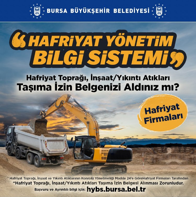 Bursa Büyükşehir Belediyesi tarafından geliştirilen ‘Hafriyat Yönetim Bilgi Sistemi’ ile kazı aşamasından, bertaraf sürecine kadar hafriyatlar sistem üzerinden anlık takip ediliyor.