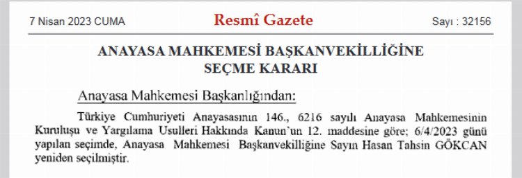 Anayasa Mahkemesi Başkanvekilliği görevine bir kez daha Hasan Tahsin Gökcan'ın seçildiğine ilişkin karar bugün Resmi Gazete'de yayımlandı.