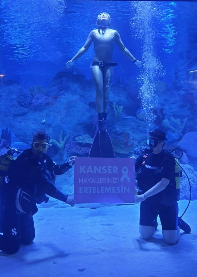 İlk olarak Prof. Dr. Fatih Aydoğan ile hastası Bahar Karacan akvaryuma dalış yaptı ve su altında “Kanser Hayallerinizi Ertelemesin” yazılı pankartı açtı.