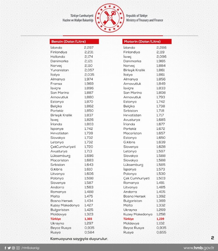 Akaryakıttaki ÖTV artışı sonrası gelen tepkilere benzin ve motorinin ülkeler arası fiyatlarına yönelik karşılaştırmalı tablo ile yanıt veren Hazine ve Maliye Bakanlığı, benzinde ve motorinde Avrupa'nın en ucuz 4'üncü ülkesi olduğunu açıkladı.