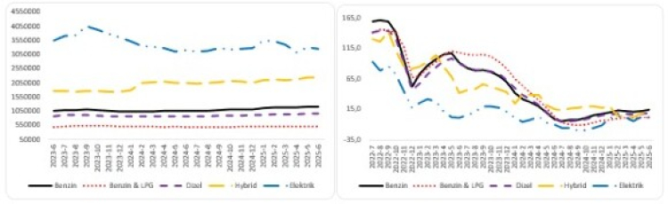 Yakıt türlerinde elektrikli araçlar hariç fiyatlar yükseldi. Haziran 2025’te benzinli araçlar 1 milyon 214 bin TL, benzin & LPG 515 bin 667 TL, dizel 966 bin 834 TL, hibrit 2 milyon 253 bin TL ve elektrikli araçlar 3 milyon 270 bin TL ortalama fiyata ulaştı. Yıllık artış oranları ise benzinlide yüzde 14,5, benzin & LPG’de yüzde 3, dizelde yüzde 9,7, hibritte yüzde 10,2 ve elektrikli araçlarda yüzde 2,1 oldu.