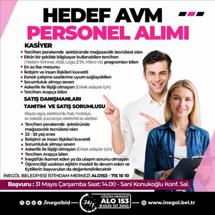 Bursa'da iş arayan ve işvereni buluşturan İnegöl Belediyesi İstihdam Merkezi, ilçede hizmet vermeye başlayacak Hedef AVM firmasının farklı alanlarda erkek ve kadın personel alımı yapacağını duyurdu.
