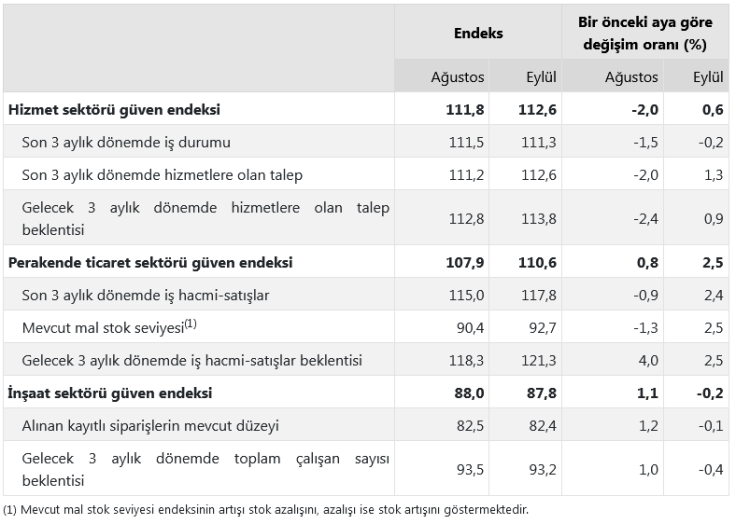 Mevsim etkilerinden arındırılmış güven endeksi Eylül ayında bir önceki aya göre; hizmet sektöründe yüzde 0,6 oranında artarak 112,6 değerini, perakende ticaret sektöründe yüzde 2,5 oranında artarak 110,6 değerini ve inşaat sektöründe yüzde 0,2 oranında azalarak 87,8 değerini aldı.