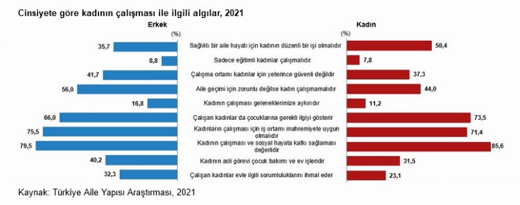 Hanehalkı işgücü araştırması sonuçlarına göre 2021 yılında 15 ve daha yukarı yaştaki istihdam edilenlerin oranının %45,2 olduğu görüldü. Bu oran kadınlarda %28,0, erkeklerde ise yüzde 62,8 oldu.